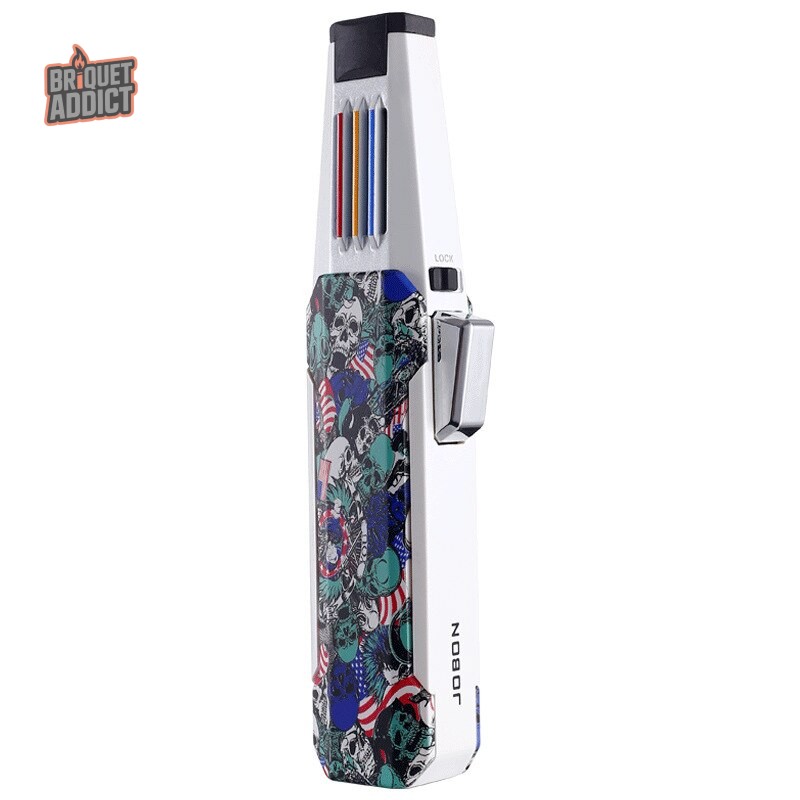 Briquet Chalumeau Rechargeable en métal, robuste et élégant. Disponible en plusieurs styles : Squelette, Bois et Or, Noir, et Camouflage. Idéal pour les amateurs de cigares.